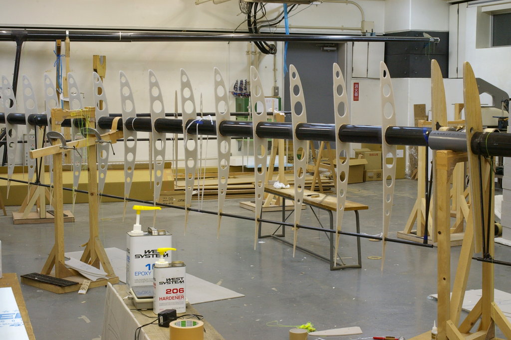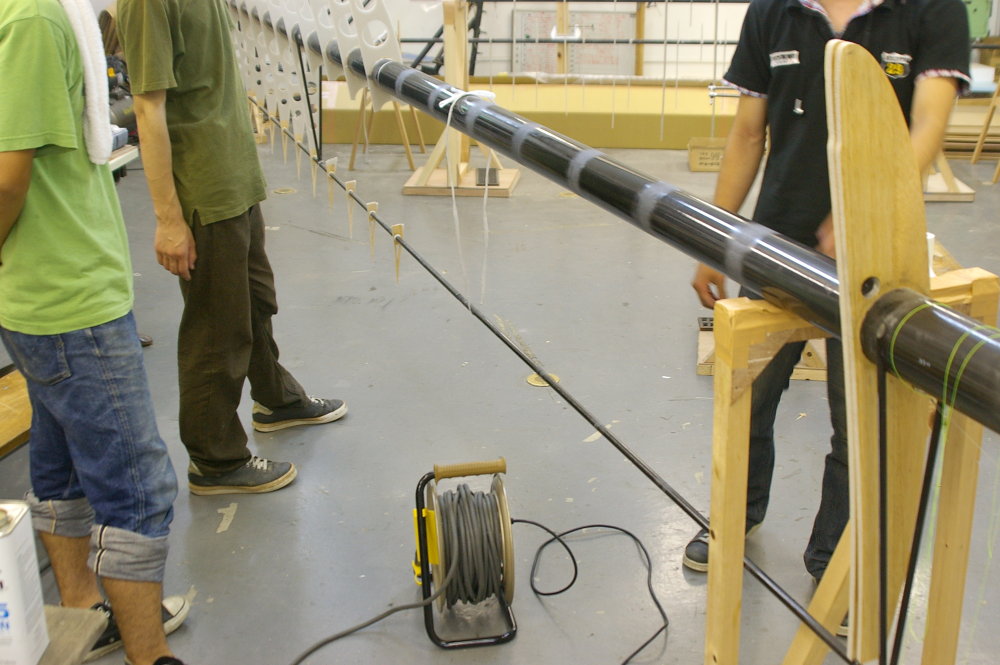 しかし、すべてのリブの接着が終わってから、リブと桁が破損する事件が起きましたので、空中で、リブの位置を出し、接着していました。