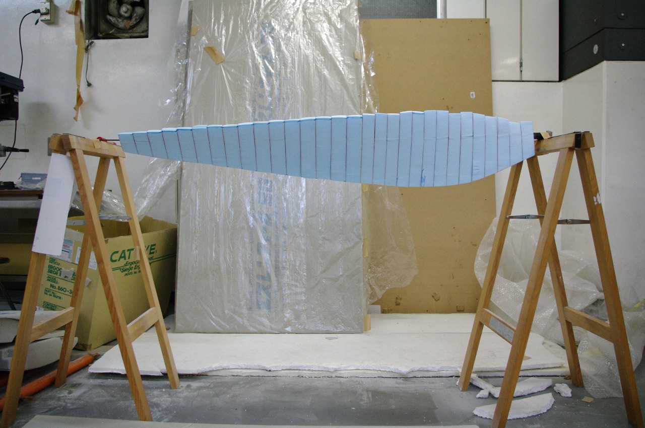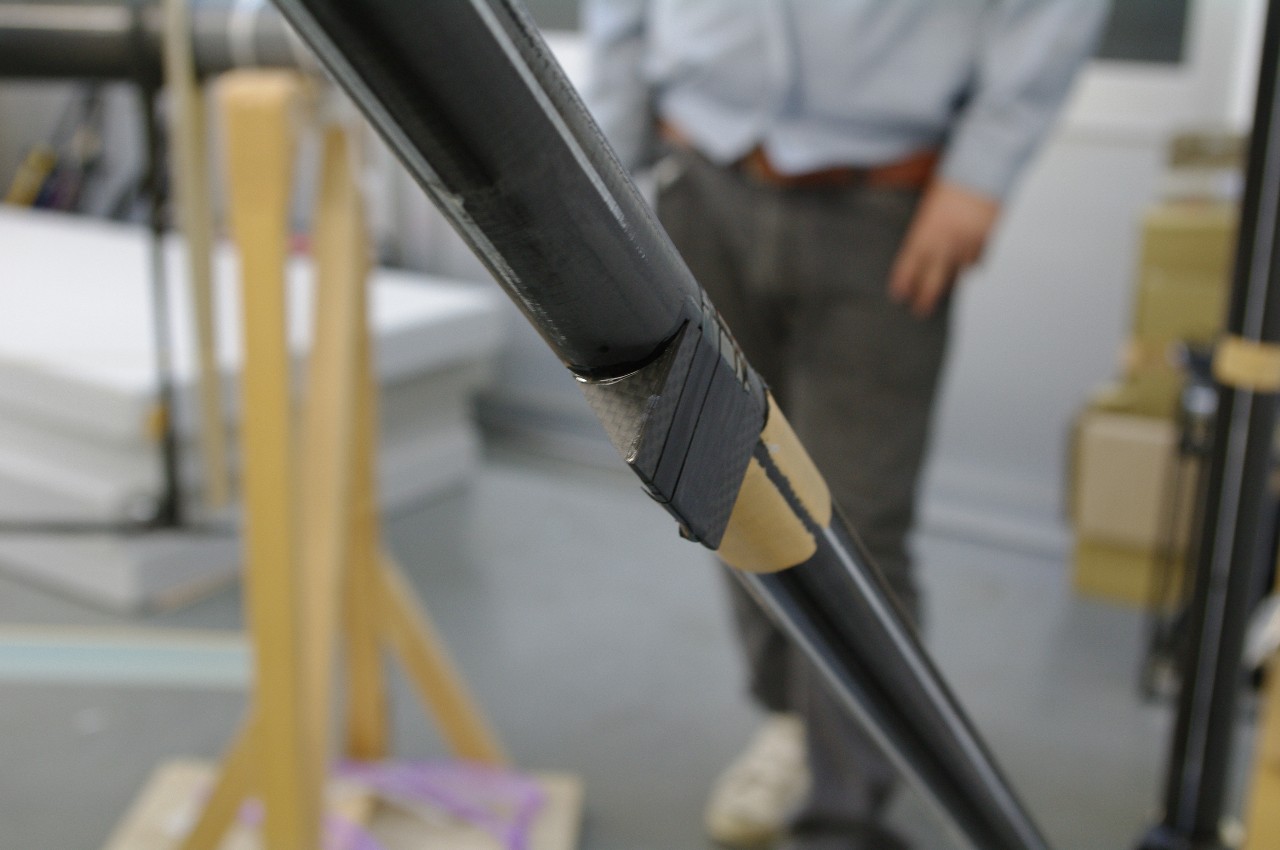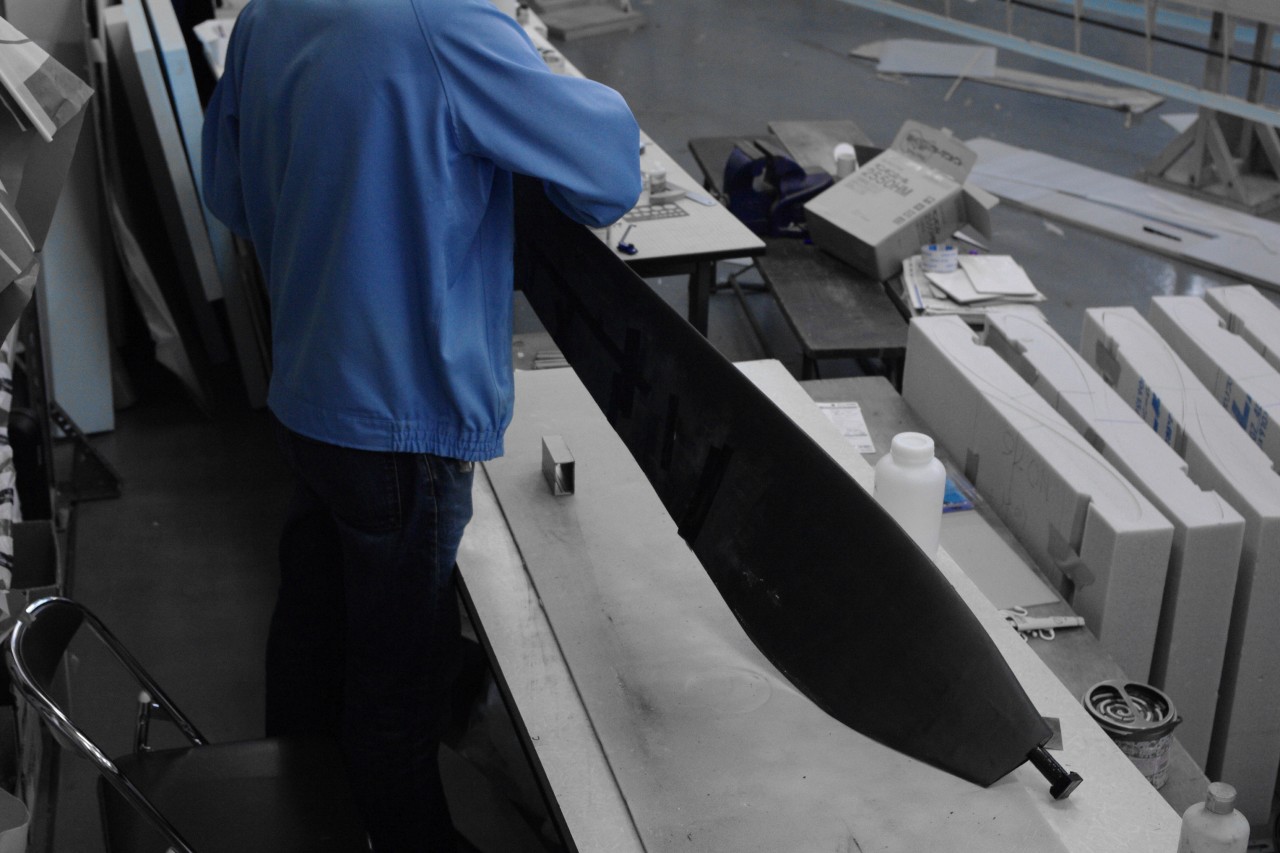 黒光り、するエポキシのよくしみ込んだカーボンクロスを、スタイロで整形したもの(前回の最後の青っぽいやつ)に丁寧に張り付けていきます。