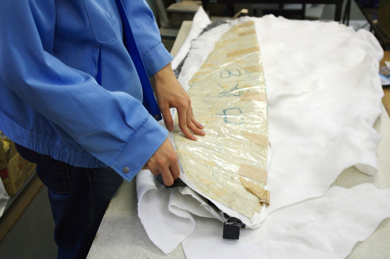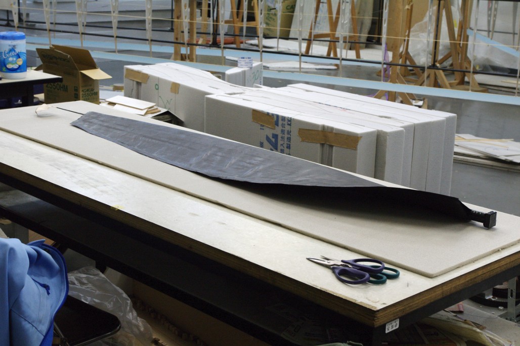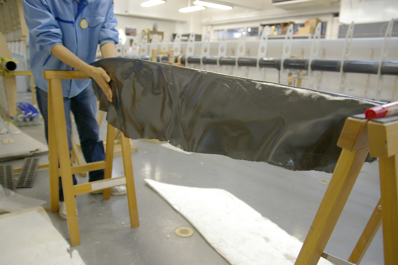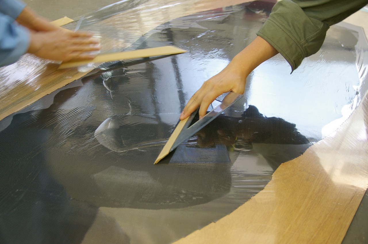 紙の型に合わせて、切り取ったカーボンクロスにエポキシ樹脂をしみこませます。