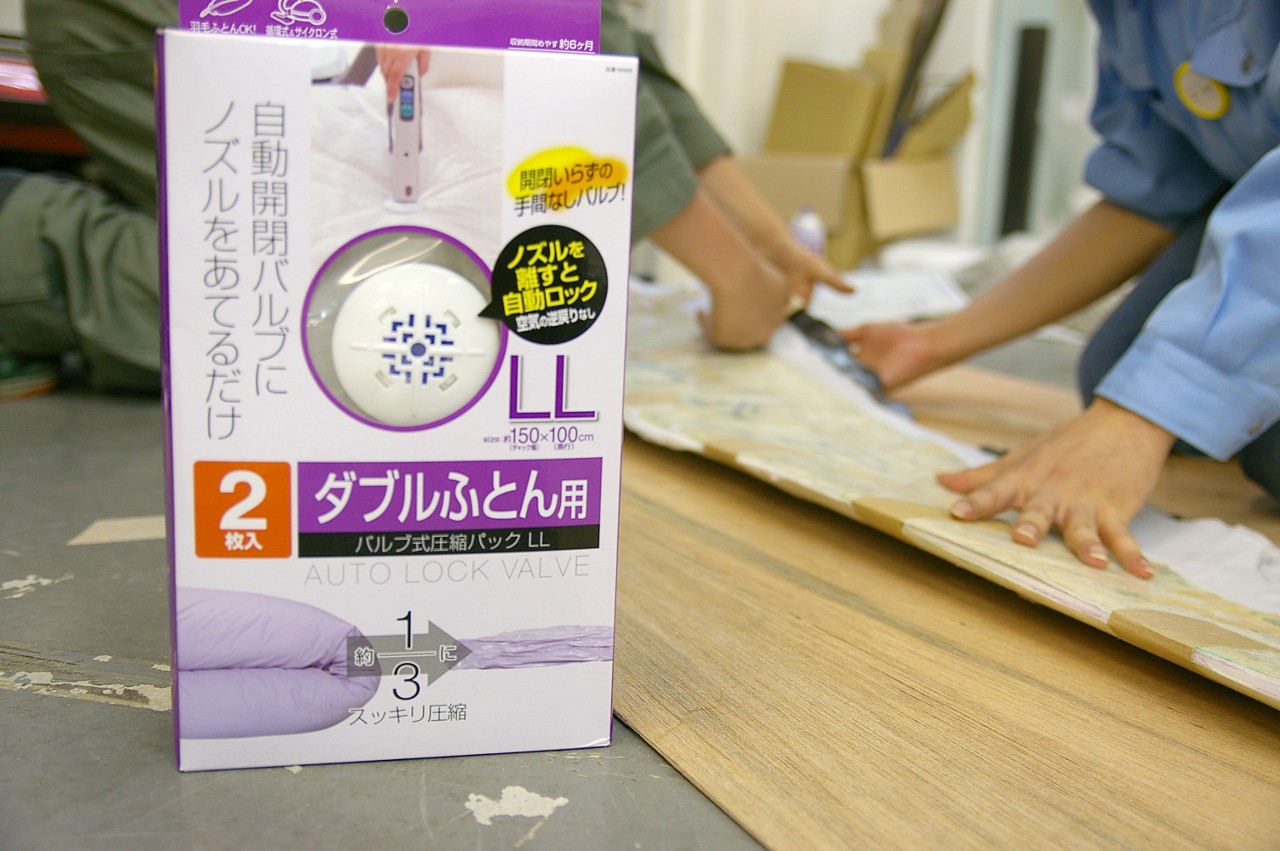 人力飛行機の製作でもおなじみ、布団圧縮袋、お得な2枚入りで¥1280(税込)です。